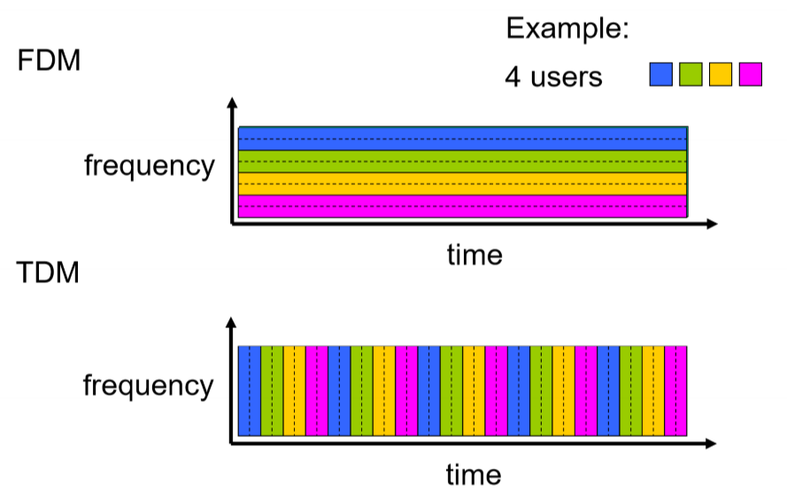 FDM(주파수 분할 다중화)과 TDM(시분할 다중화)으로 나누어 설명할 수 있는데, FDM은 할당된 대역폭을 나누어 사용하는 방식이고 TDM은 할당된 대역폭을 시간단위로 나누어 번갈아가면서 사용하는 방식이다.