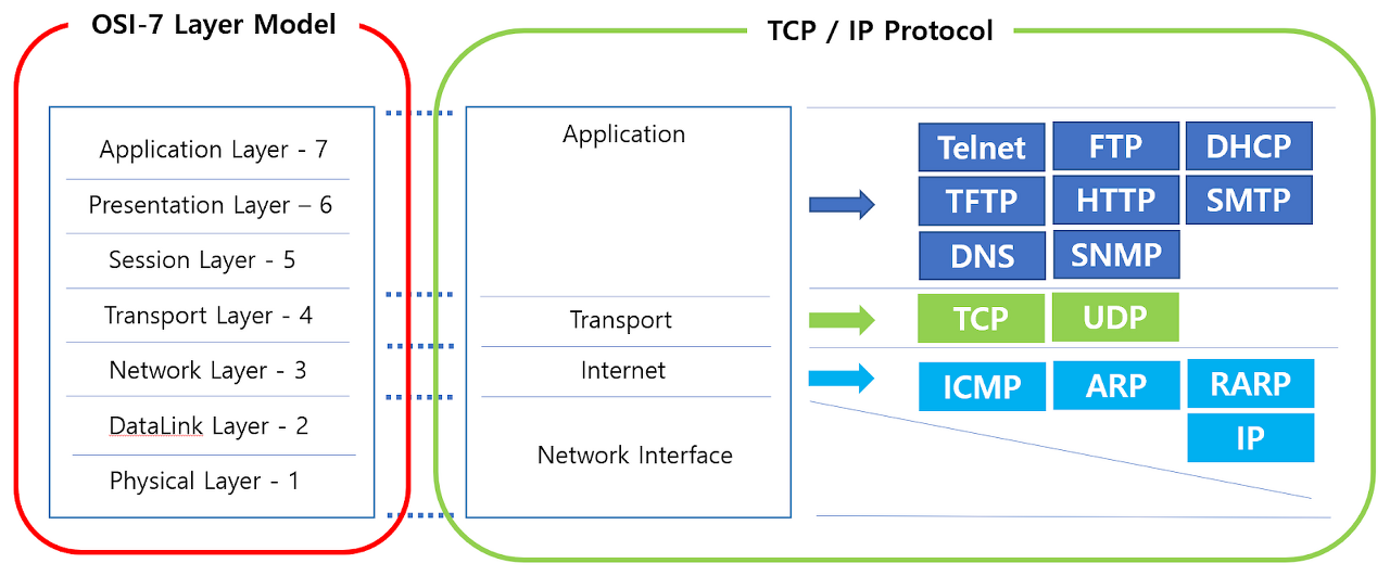 TCP UDP는 TCP/IP 프로토콜 모델에서 전송 계층에 해당한다. 전송(트랜스포트) 계층은 응용 프로그램과 네트워크 사이에서 중재하는 역할을 맡고 있으며, 애플리케이션 프로세스들 간의 논리적 통신(logical communication)을 제공한다.