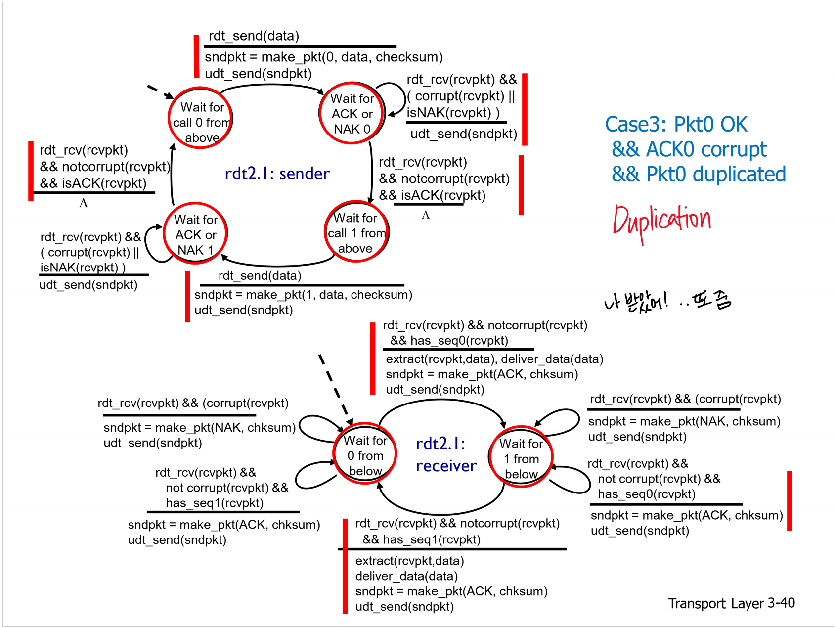 이번에는 receiver가 받는 건 잘 받아서 ACK를 날렸는데 해당 ACK가 sender쪽으로 가면서 1.ACK가 깨져서 가거나 2. NAK가 갔다. 따라서 재전송하였는데 이 때에는 duplication이 발생한다. 그러면 "아냐, 나 잘 받았어" 하고 ACK를 다시 보낸다.