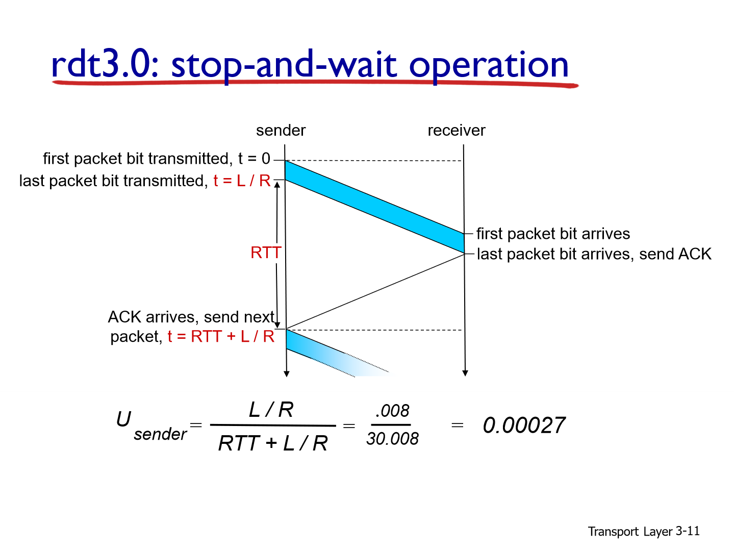 이 rdt 2.1은 sequence number가 사실상 0과 1 뿐이다. 이는 stop and wait 방법을 채택하기 때문에 가능하다. 하지만 생각해보면 가장 마지막 패킷의 경우에는 이 0과 1에서 혼동이 와서 전송이 제대로 이루어지지 않을 수 있다.