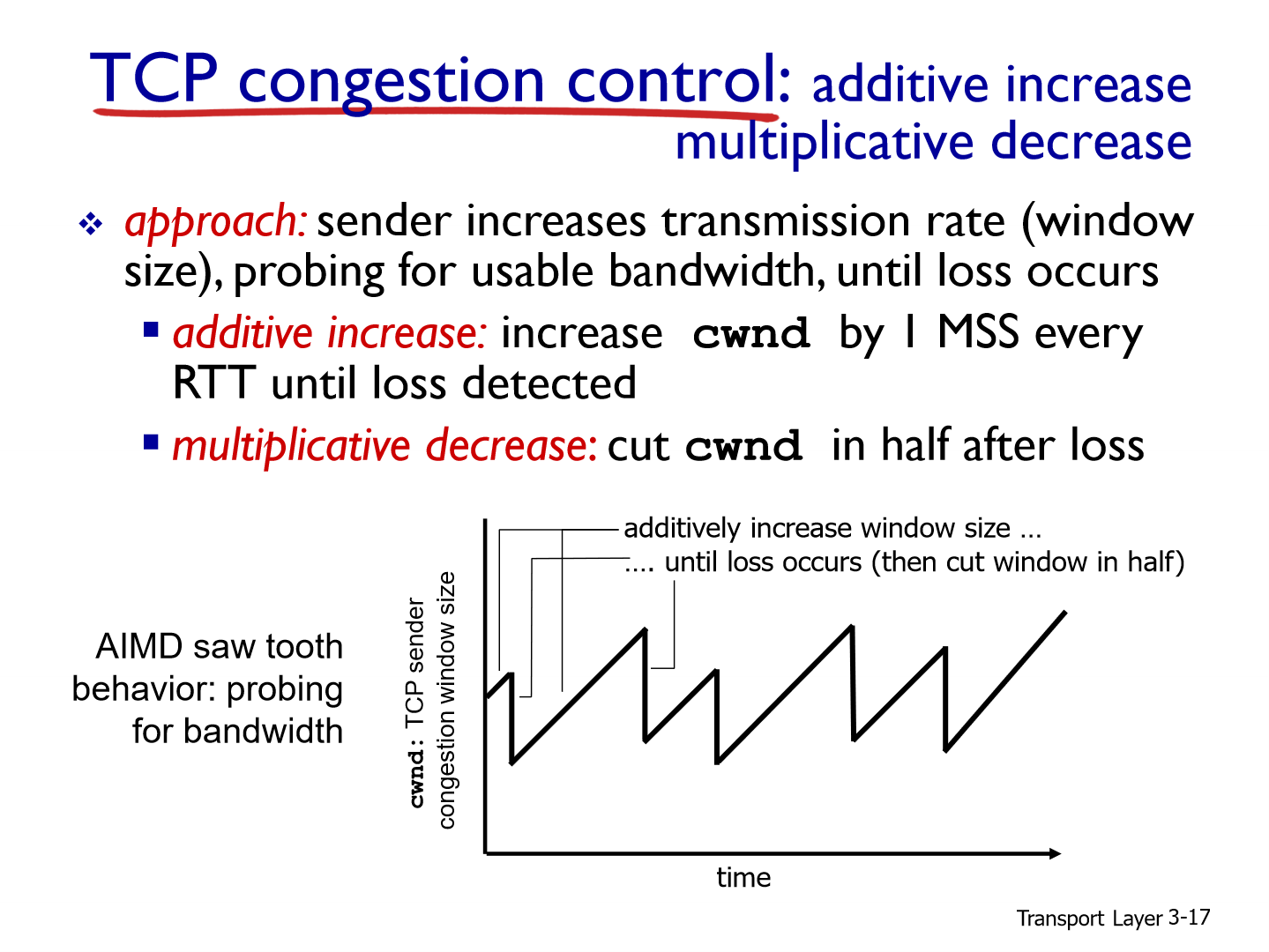 위에서 볼 수 있는 그래프가 톱니바퀴 모양인 이유를 알 수 있는 알고리즘이다. 자신의 혼잡 윈도우의 값은 선형으로 증가하다가, 손실 사건이 발생하면 갑자기 그 현재 값의 반으로 떨어지는 사이클을 반복한다.