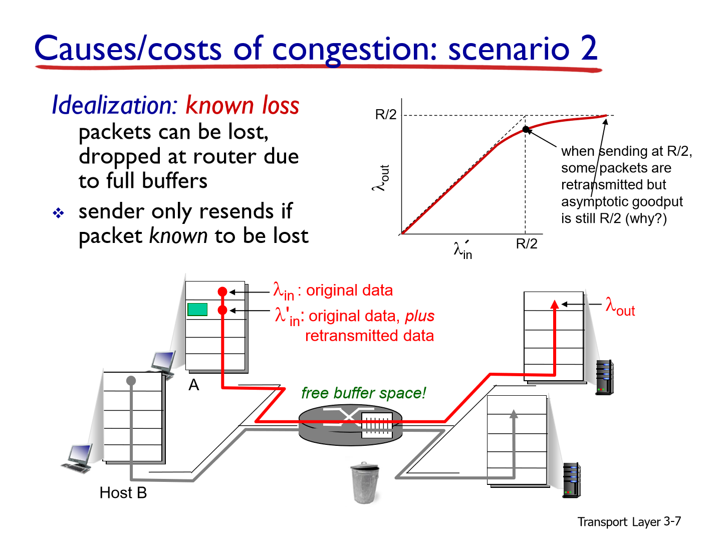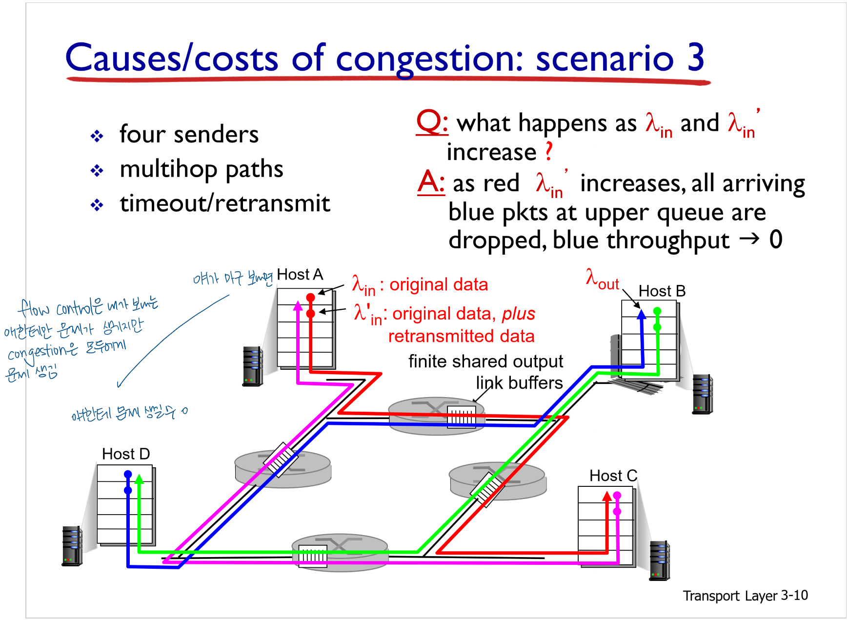 간단히 말하면 이 경우에서는 Tradeoff가 발생할 수 있다. 즉 Host A에서 마구 보내게 되면, A-C 트래픽과 B-D 트래픽은 버퍼 공간을 한 버퍼에서 경쟁해야 하므로 오히려 Host D에서 congestion 문제가 생길 수 있다.