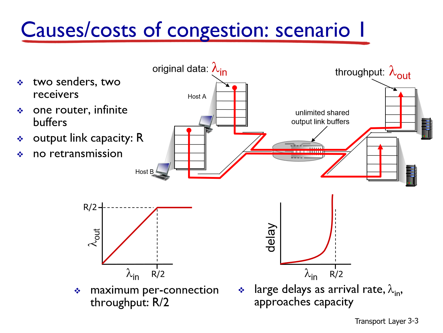 그림에서 볼 수 있듯 Host A에서도 한 쪽으로, Host B에서도 한 쪽으로 데이터를 보내고 있다. R/2만큼의 공간을 쓴다고 하면, 아래에 볼 수 있는 그래프처럼 R/2까지 전송함에 따라 처리량도 R/2까지 점차 증가한다. 하지만 링크는 전송량이 R/2를 넘어가면 더이상 R/2를 초과하여 전송할 수 없다. 따라서 R/2에 근접함에 따라 지연률이 극한에 달하게 된다.