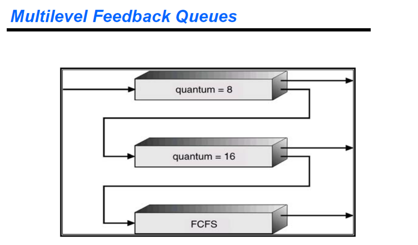 그럼 과정을 살펴보자. Ready Queue에 들어오는 프로세스는 큐 0에 넣어진다. 큐 0에 있는 프로세스는 8밀리초의 time quantum이 주어진다. 만약 프로세스가 이 시간 안에 끝나지 않으면 아래로 내려간다. 여기에서도(16밀리초) 완료되지 않으면 아래로 내려가고 이 프로세스들은 이후 FCFS 방식으로 실행된다.