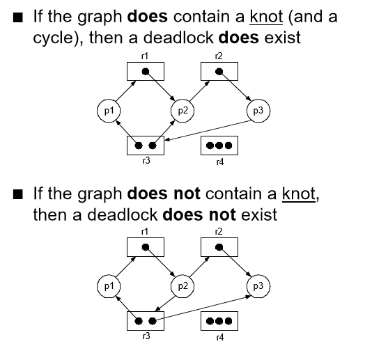 따라서 우리는 knot은 deadlock을 발생시키는 '충분 조건'이 될 수 있으나 '필요 조건'은 되지 않아 위의 deadlock 필요조건에 설명하지 않는다고 말한다. 즉 일어날 '수도' 있으나, 교착상태를 발생시키기 위해 반드시 knot이 존재할 필요는 없다.