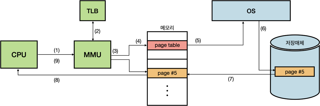 5. TLB 미스: MMU는 페이지 테이블을 참고하여 가상 페이지 번호에 대응하는 물리 페이지 번호를 찾는다. 이후 TLB에 해당 엔트리를 저장하여 이후 재사용할 수 있도록 한다. 이제 물리 주소를 찾을 수 있어 메모리에 접근한다.