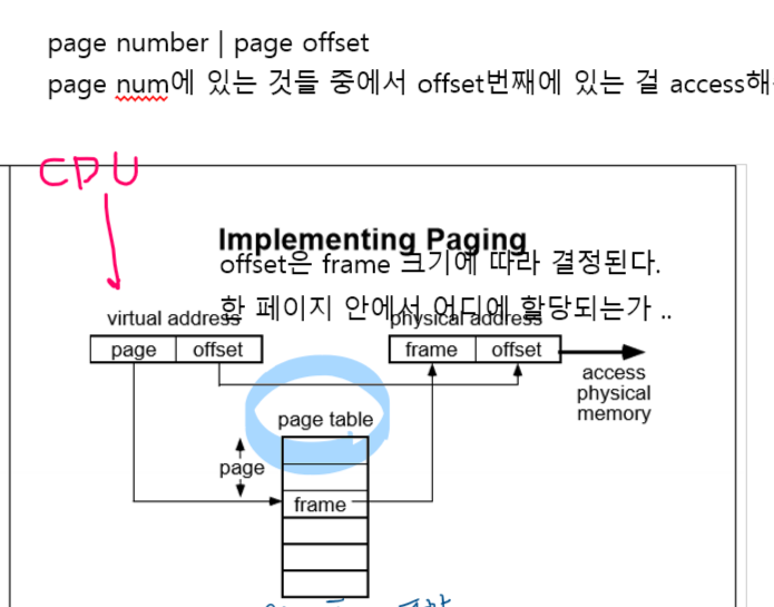 이 main memory에 있는 것을 frame이라고 한다. 그러면 만약 해당 text가 124개의 frame이 필요하다고 하면 124개의 frame을 할당받는다. 그러면 124개는 연속적으로 할당하는 것이 아니라 마구마구 집어넣는다. 그러면 그걸 명시해줄 수 있는 page table(MMU와 비슷한 기능을 한다. 주소 번역!) 을 따로 표처럼 만들어서 어디에 넣었는지 명시해둔다.