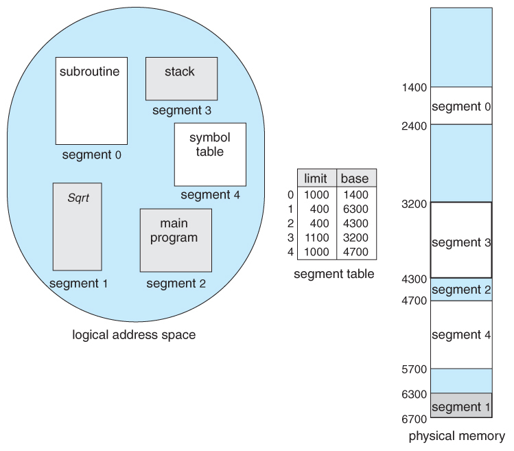 위에서 볼 수 있듯이 segment table은 두 개로 나누어져 있다. base는 시작하는 위치, 그리고 해당 segment의 크기가 limit에 mapping된다.