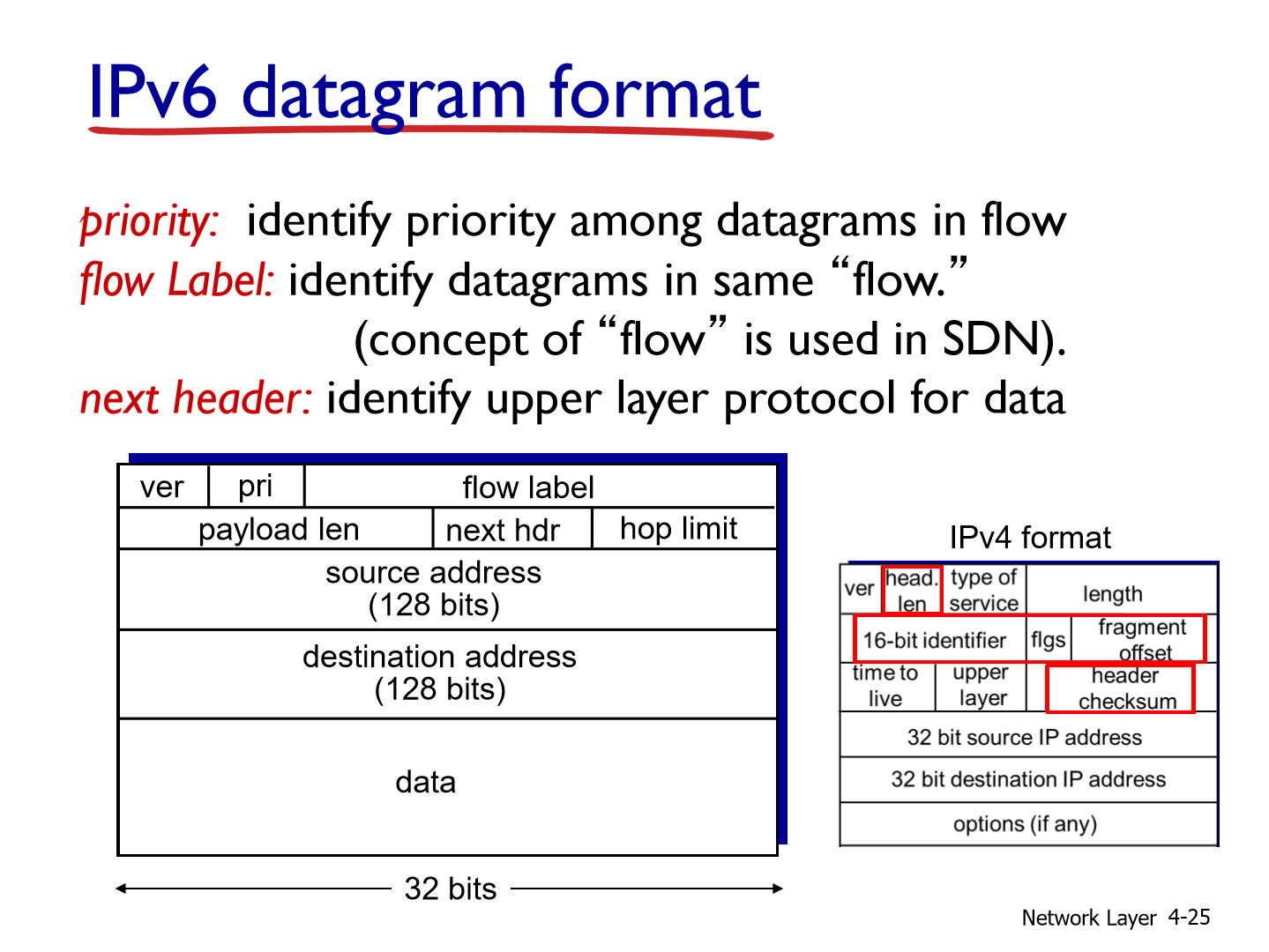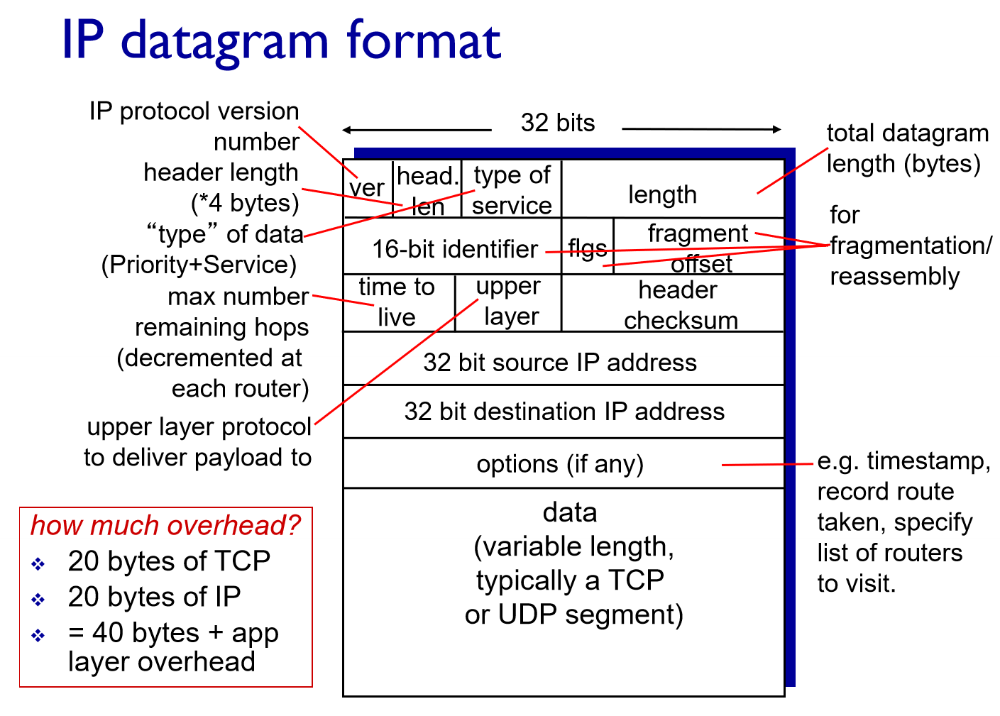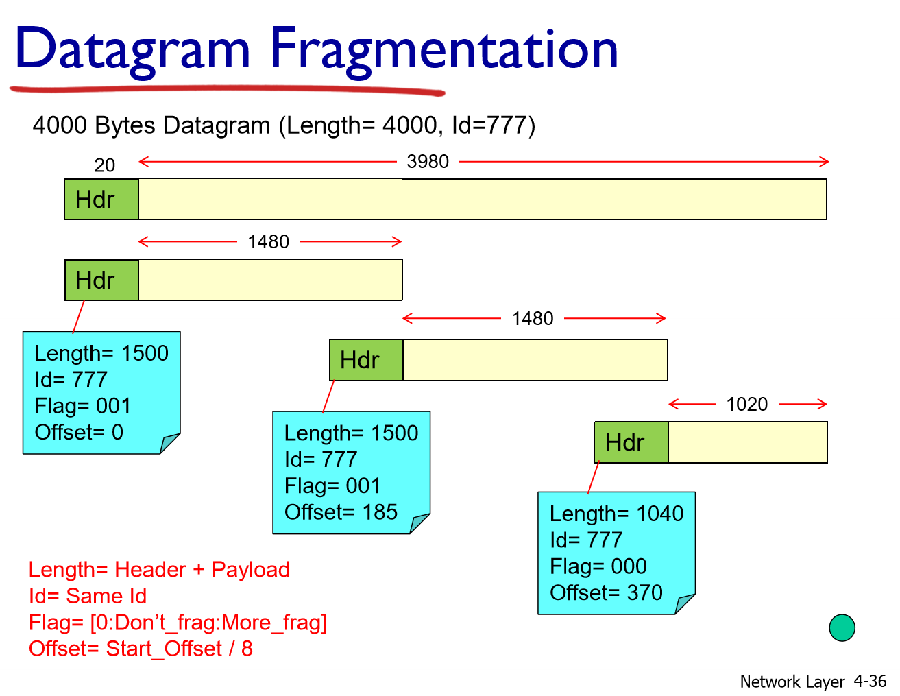 네트워크 링크에는 MTU(max transfer size, 링크 계층 프레임이 전달할 수 있는 최대 데이터 양)가 지정되어 있어 큰 datagram을 자르는(fragment) 과정이 필요하다. 이후 final destination에서만 재정렬(reassemble) 하면 된다. 재정렬할 때 필요한 것이 header에 저장되어 있으며 식별자, 플래그, 단편화 오프셋 필드가 그것이다.