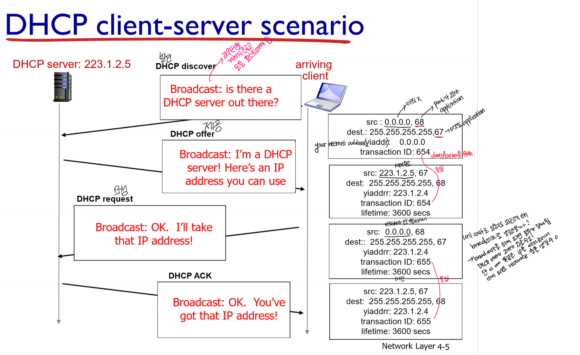 client가 우선 broadcast, 대신 dest.port #67은 Is there a DHCP server out there? 하고 질문