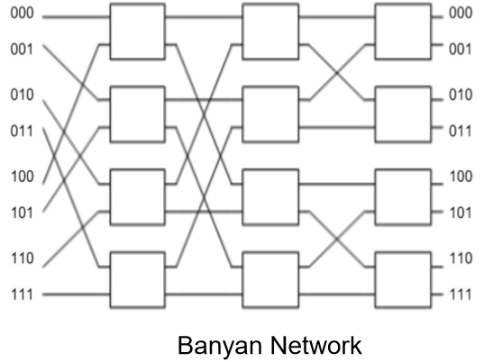 반얀 네트워크 방식은 프로세스들을 연결하는 멀티 프로세스로, crossbar의 특징을 가지고 있다.