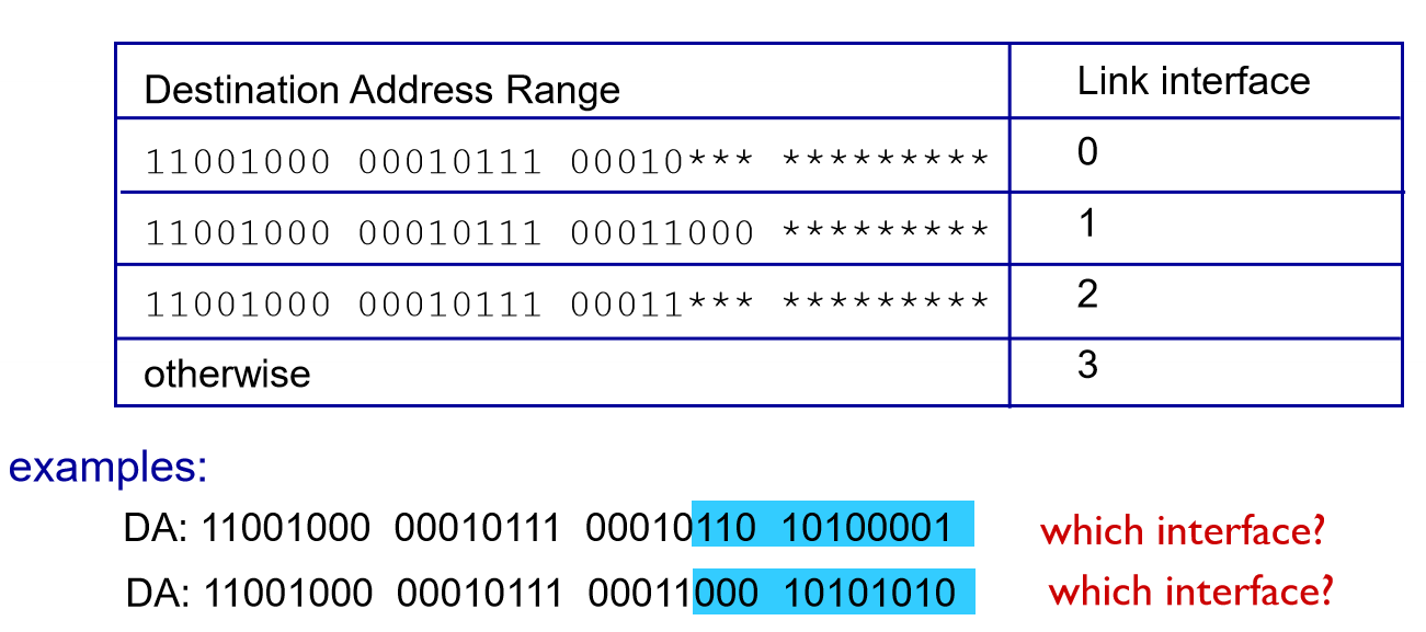 데이터그램 포워딩 테이블은 단순히 목적지 주소와 출력 링크로만 이루어져 있다. 이 세상에는 40억개의 주소가 있는데, 이를 라우터에 다 들여보낼 수는 없기 때문에 address range를 영역으로 정해서 넣어둔다.
