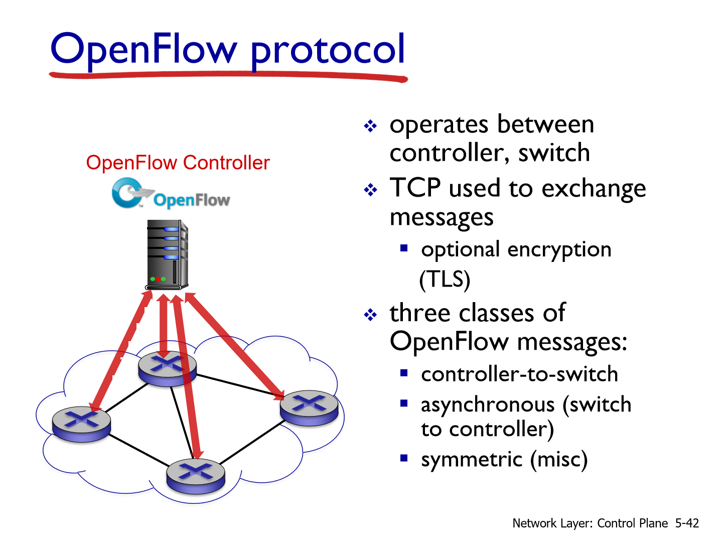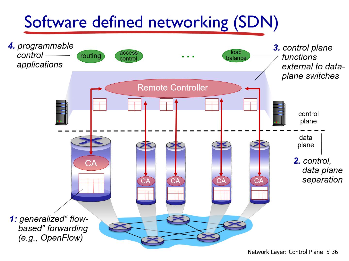 SDN에서는 모든 네트워크 스위치들의 플로우 테이블 항목들을 계산하고 관리, 설치하는 일들이 SDN 제어 평면의 임무이다. SDN에서 제어되는 스위치들에서의 패킷 포워딩은 전송/네트워크/링크 계층 헤더의 어떤 값들을 기반으로도 이루어질 수 있다. - 데이터 평면과 제어 평면의 분리