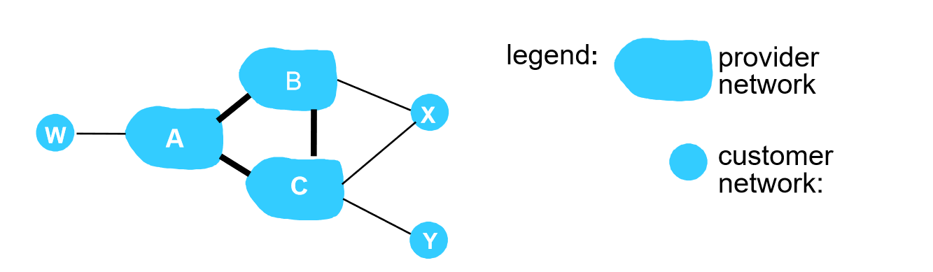 상황을 우선 살펴보자. 그림에서 AS W,X,Y는 스텁 네트워크이고, A, B, C는 백본 제공자 네트워크이다.