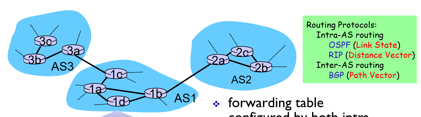 또한 한 AS에서 외부 목적지 AS에 패킷을 전달하는 라우터를 게이트웨이 라우터(gateway router)라고 한다. 위의 그림에서 3a, 1c, 1b, 2a 라우터가 gateway 라우터이다.