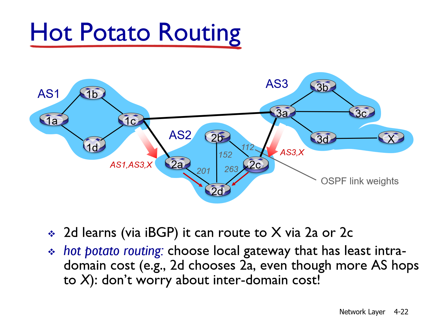 핫 포테이토 라우팅에서 AS는 가능하면 빨리(저렴하게) 패킷(뜨거운 감자)을 없앤다. 현재 예에서 2d에서 동작하는 핫포테이토 라우팅은 1a와 2c로의 경로 비용을 결정하기 위해서 intra-AS 라우팅 프로토콜로부터의 정보를 사용하고, 최소비용의 경로를 선택한다.
