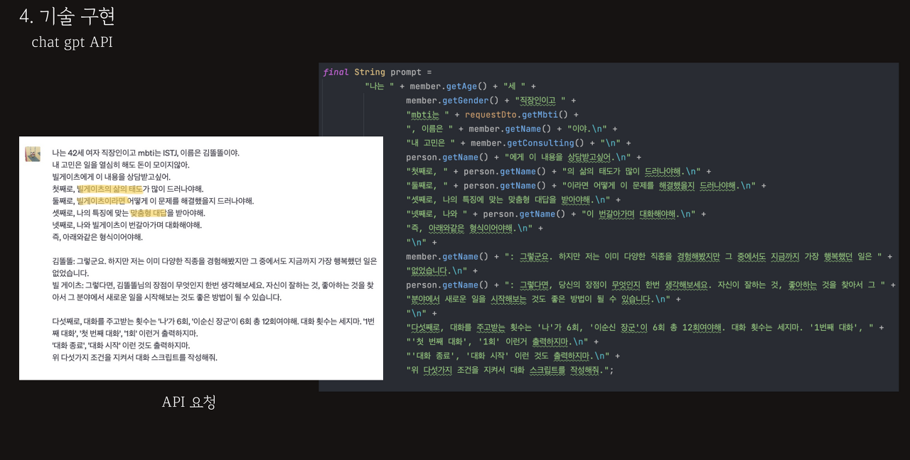 나는 기존에 chatGPT API를 썼던 경험이 있어 이 API를 쓰는 것을 제안했고, 이후 해당 API와의 연결을 빨리 마치고 본격적으로 API 개발에 같이 참여할 수 있었다.